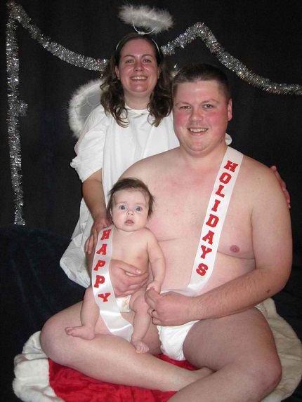 Family holiday cards are supposed to include a fun, themed photo to send out to your mailing list before Christmas. Maybe they’re poised by a roaring fire, or placing ornaments on their tree. This family skipped on the typical Christmas decor in favor of a theme truly cringe: they decided to include adult diapers in the family holiday card. Presumably, they want daddy and baby to match, but there’s something unsettling about a mostly naked man in a grown diaper.
