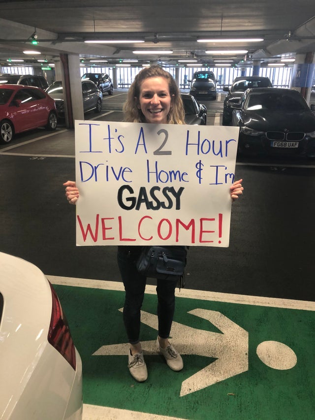Everyone loves a warm welcome back. But is it really necessary to be explicit about how much you miss your loved ones in public. Leave it to your family to make sure you are embarrassed in an epic way. She is making it very clear upon the arrival of her loved one that it will be a long journey, and she has some bowel issues. Thanks for the heads up lady. You wouldn’t want to be in this car!
