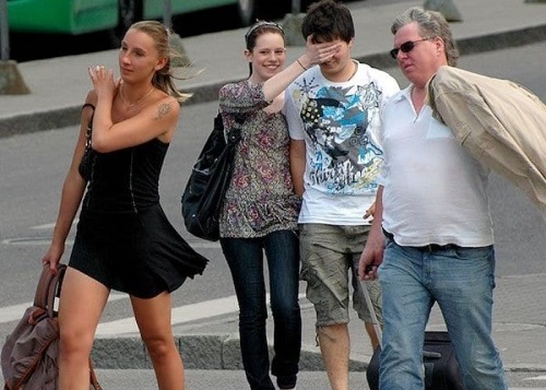 When on a stroll with your missus, what are the chances that a seductively dressed lady will be walking right in front of you? We’ve all been there, and although men try as hard as possible not to look, sometimes the temptation is far too strong to resist. This guy’s eyes might have wandered down a wrong path, but his woman gladly brings him back to his rightful path. The woman giggling while blocking the guy’s view makes for an adorably cute photo.