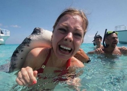Snorkeling adventures are usually fun-filled activities where sometimes you get to swim side by side with marine wildlife. Stingrays, although deadly when provoked, are gentle creatures that enjoy human-wildlife interactions. The woman pictured below wanted a stingray photo moment, but the stingray’s fluffy, greasy skin made the woman shrink with absolute fear. The guys at the back are undoubtedly enjoying the woman’s misfortunes, but we sure hope the woman wasn’t stung by the stingray.