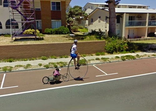 The Penny Farthing, famously known as the high wheeler, was the first two-wheeled machine called a bicycle. The bike was famous in the 1870s and was a reserve for the wealthy in society. However, bike enthusiasts have been spotted riding these giant bikes on busy streets over the past couple of years. This image might be an impressive sighting on Google Street View, but is that a penguin riding behind the Penny Farthing? We surely hope not.