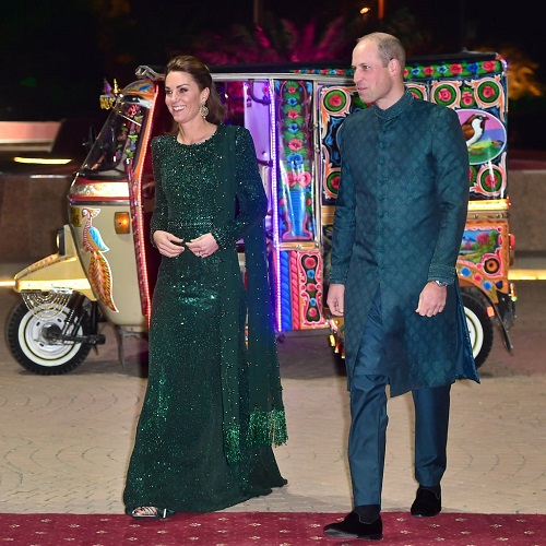 Just when you think you have seen it all, in 2019, the Duke and Duchess of Cambridge prior to the grand evening reception, attended to their royal duties in a relaxed and casual attire. But at the glamorous evening reception held at the National Monument in Islamabad Pakistan, the royals arrived in a stunningly divine wardrobe, fit for royalty. Kate chose an emerald green heavily embellished sequined gown by Jenny Packham pairing it with Jimmy Choo sandals. William matched with his wife in teal sherwani. Royal couple goals.