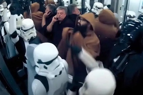 Dressing up to go to a party is often filled with excitement. It seems there might have been a Star Wars party happening in town. This man was bombarded by stormtroopers and other Star Wars-inspired lookalikes. The gang of Star Wars fanatics seems rather excited that they have entered the elevator. The man squashed in the corner of the elevator seems rather overwhelmed by the entry of the group and perhaps wished he was on a call with 911 to help get him out of there.